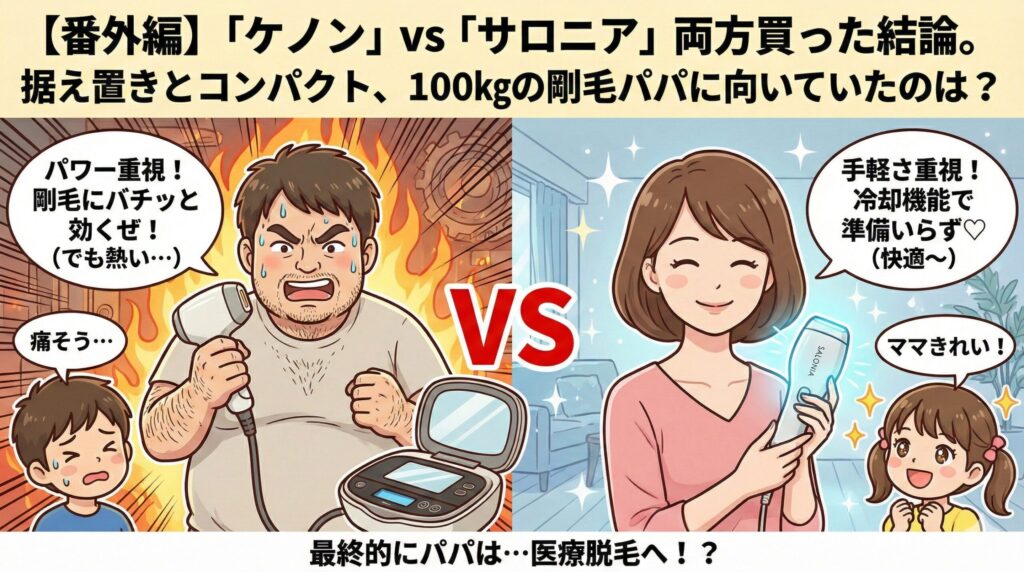 【番外編3】「ケノン」vs「サロニア」両方買った結論。据え置きとコンパクト、100kgの剛毛パパに向いていたのは? 身長188cm・体重100kg。前回の記事で「シェーバーで満足できなくなったら、家庭用か医療へ進め!」と書いた巨漢パパ(私)です。 実は私、... -