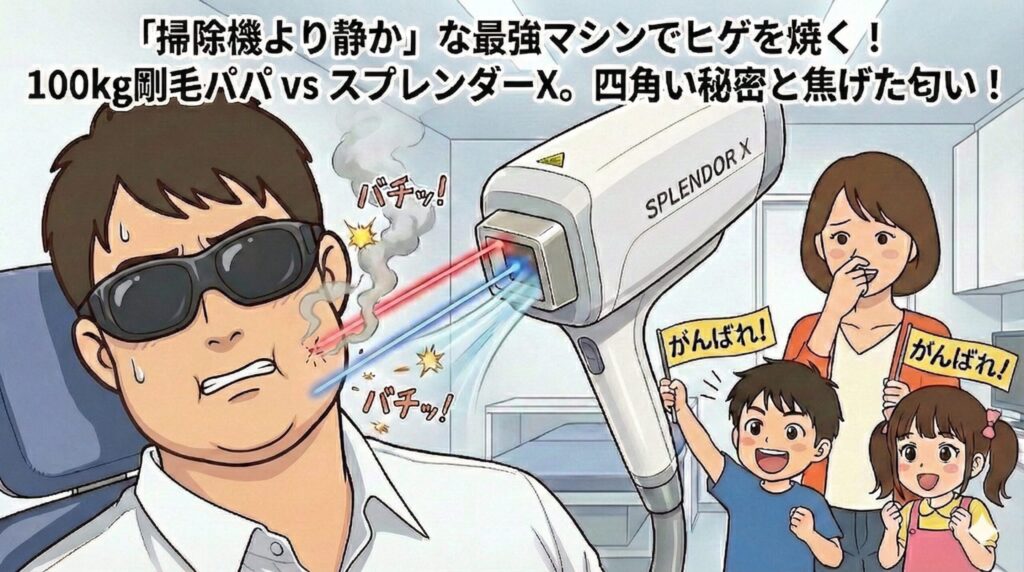 【第11話】「掃除機より静か」な最強マシン。100kgパパのヒゲを焼く「スプレンダーX」の音と匂い、そして四角い秘密 前回の記事(第10話)で、2回目のVIO脱毛を終えた私(100kgの巨体パパ)。今回はその流れで、剛毛パパの象徴である「ヒゲ脱毛(顔)」の... -