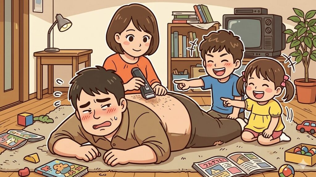 子供たちの笑い声に包まれながら、妻に背中の毛を剃られるパパ。 文字にすると少し情けない気もしますが、これもまた「家族公認の脱毛プロジェクト」ならではの、平和で温かい光景です。